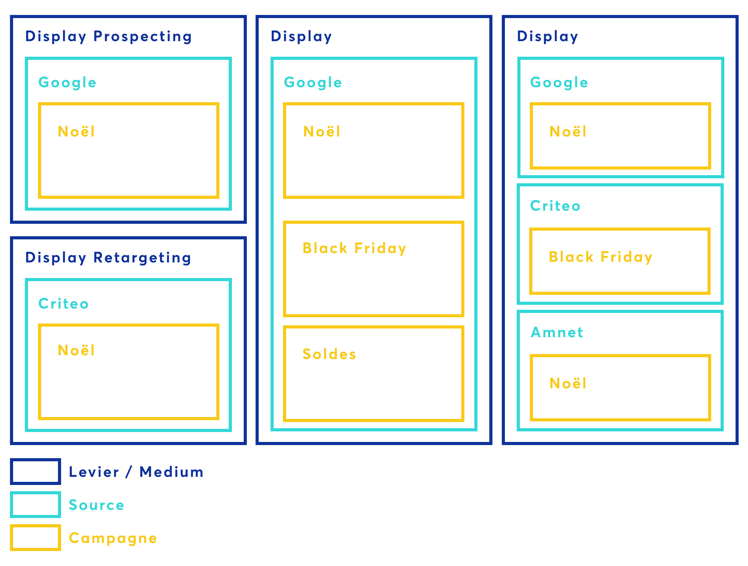 Recommandation Wizaly : Il n’existe pas de nomenclature unique mais une bonne pratique est d’utiliser l’UTM source pour le partenaire média (Google, Facebook, Criteo, etc.), l’UTM médium pour qualifier le levier (retargeting, search, email, etc.) et l’UTM campagne pour identifier les caractéristiques d’une campagne lancée sur plusieurs leviers (« Black Friday 2019 », « Fil rouge Ile de France », « Solde Electroménager », etc.). Attention également à faire en sorte qu’au sein d’une campagne il n’y a pas plusieurs stratégies (ex : retargeting ou prospecting).
